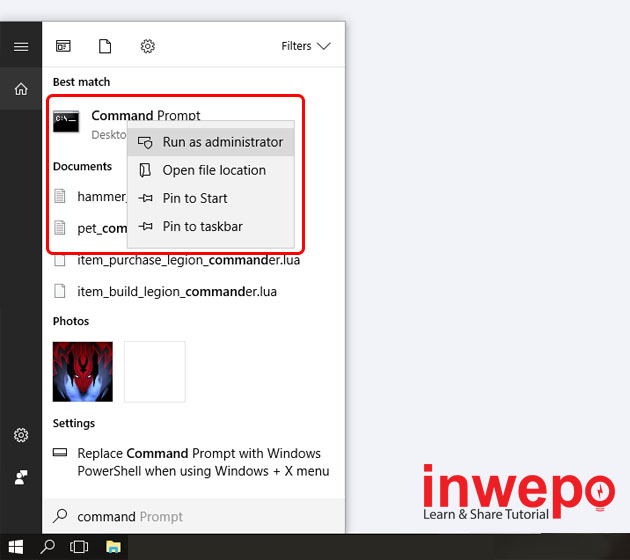 1. Buka Command prompt – Ketik Command di pencarian Windows – Kemudian klik kanan pada Command Prompt pilih Run as administrator.