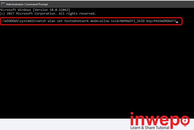 netsh wlan set hostednetwork mode=allow ssid=NAMAWIFI_SSID key=PASSWORDWIFI