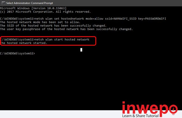 3. Pengaturan Hotspot sudah dibuat – Kemudian aktifkan Hotspot tersebut dengan memasukkan perintah berikut pada Command Prompt atau CMD: