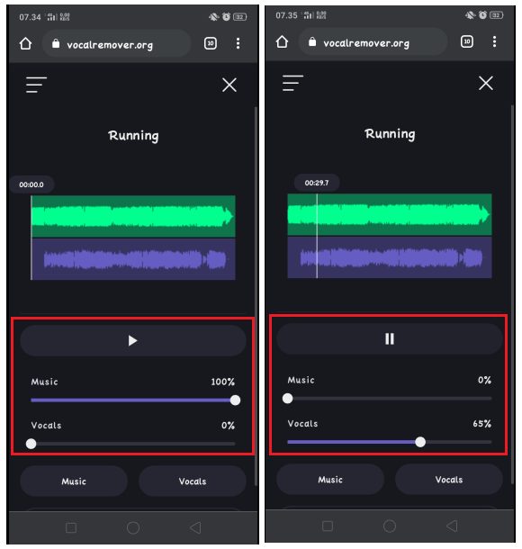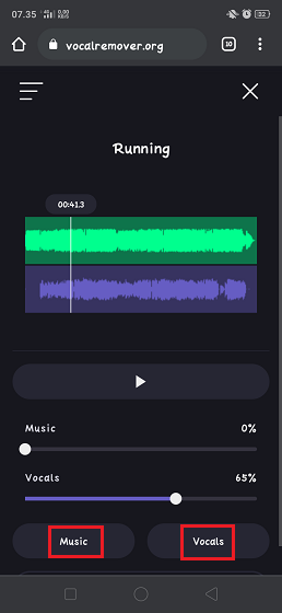 6. Berikut tampilan ketika vocal dan instrument lagu sudah terpisah. Untuk mendengarkan instrumet yang sudah terpisah dengan vocal; pilih kolom music, atur volume instrument dan tekan tombol play. Sedangkan untuk mendengarkan suara vocal yang sudah terpisah dari instrument lagu; pilih vocal, atur volume vocal dan tekan tombol play.