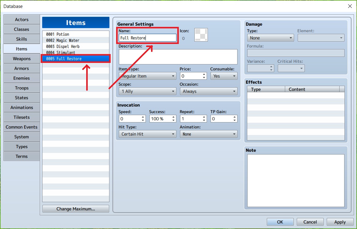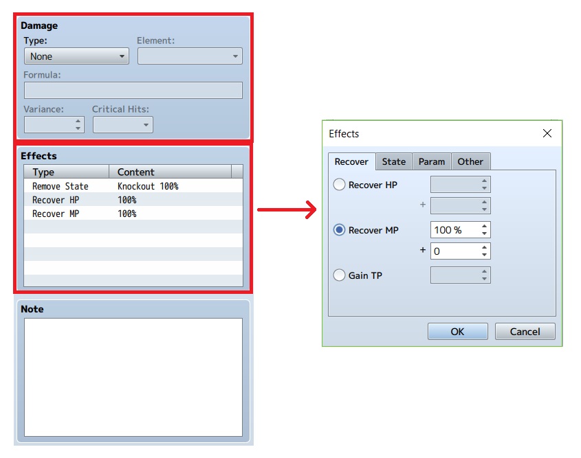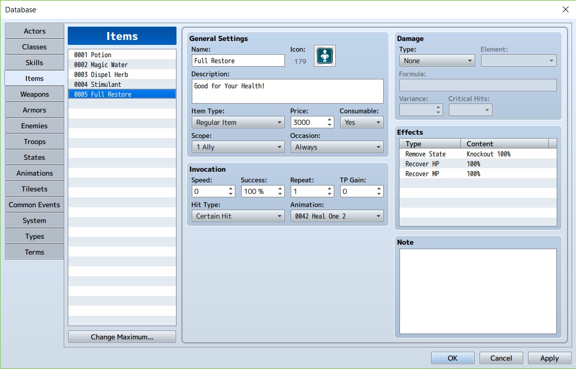 10. Effect memiliki fungsi untuk menambahkan bermacam-macam effect pada target jika menggunakan item. Karena kita butuh untuk menyembuhkan seutuhnya, jadi kita ubah saja sesuai dengan gambar. Kemungkinan terkena bisa kita atur sendiri juga. Lalu di bawahnya terdapat Note untuk membuat catatan agar tidak lupa.