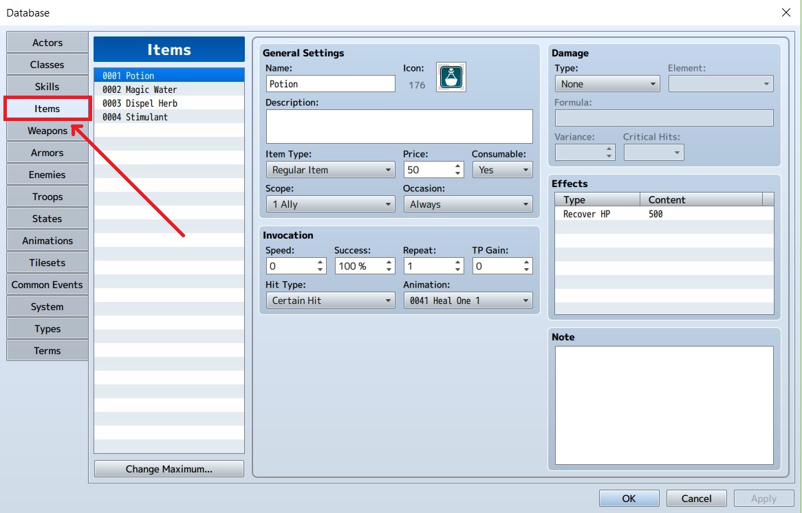 9. Di sebelah kanan terdapat bagian “Damage”, “Effects”, dan “Note”. Damage berfungsi untuk mengatur besarnya nilai yang didapatkan dari item yang berkaitan. Karena kita mengharapkan nilai healnya full maka lebih baik jika kita mengatur di effects. Variance membuat nilai dari item yang kita gunakan akan berada sebesar 10% kurang dari nilai formula sampai 10% lebih dari nilai formula. Critical Hit tidak kita pakai karena kita tidak menggunakan Critical pada item.