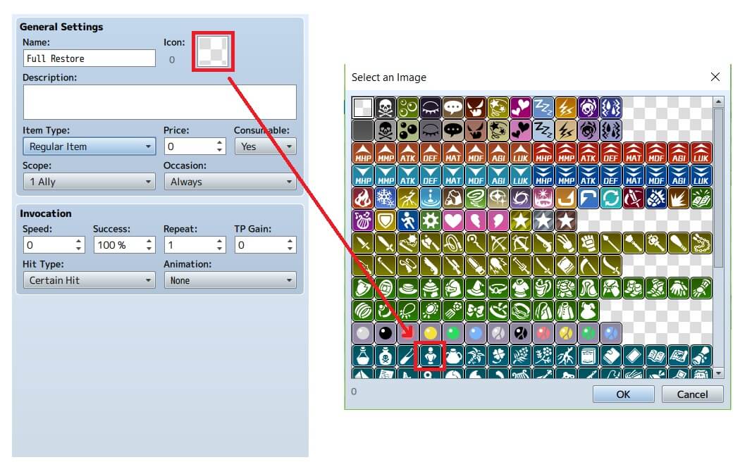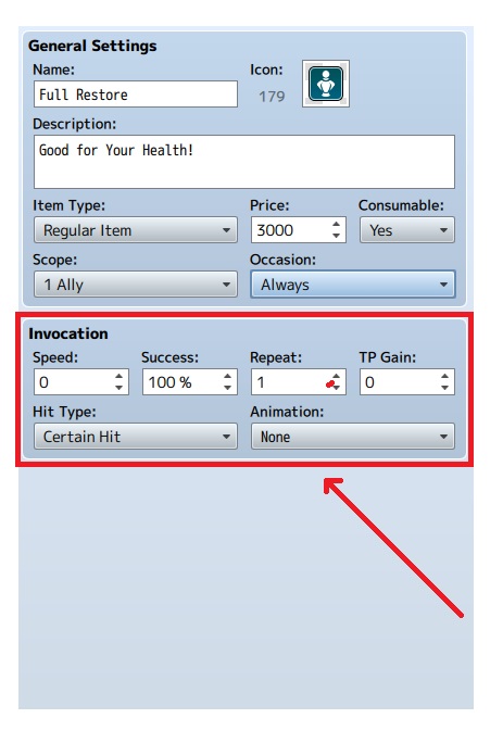 8. Di bawahnya terdapat menu “Invocation”. Disini kita bisa mengatur apa-apa saja yang digunakan oleh skill kita. Speed mengatur kapan item dijalankan, Success mengatur besarnya kemungkinan item kita berhasil digunakan, Repeat mengatur berapa kali item berulang saat diaktifkan, TP Gain mengatur besarnya TP yang didapatkan saat menggunakan item, Hit Type mengatur jenis serangan yang digunakan, Sedangkan Animation mengatur jenis animasi apa yang digunakan untuk skill tersebut.