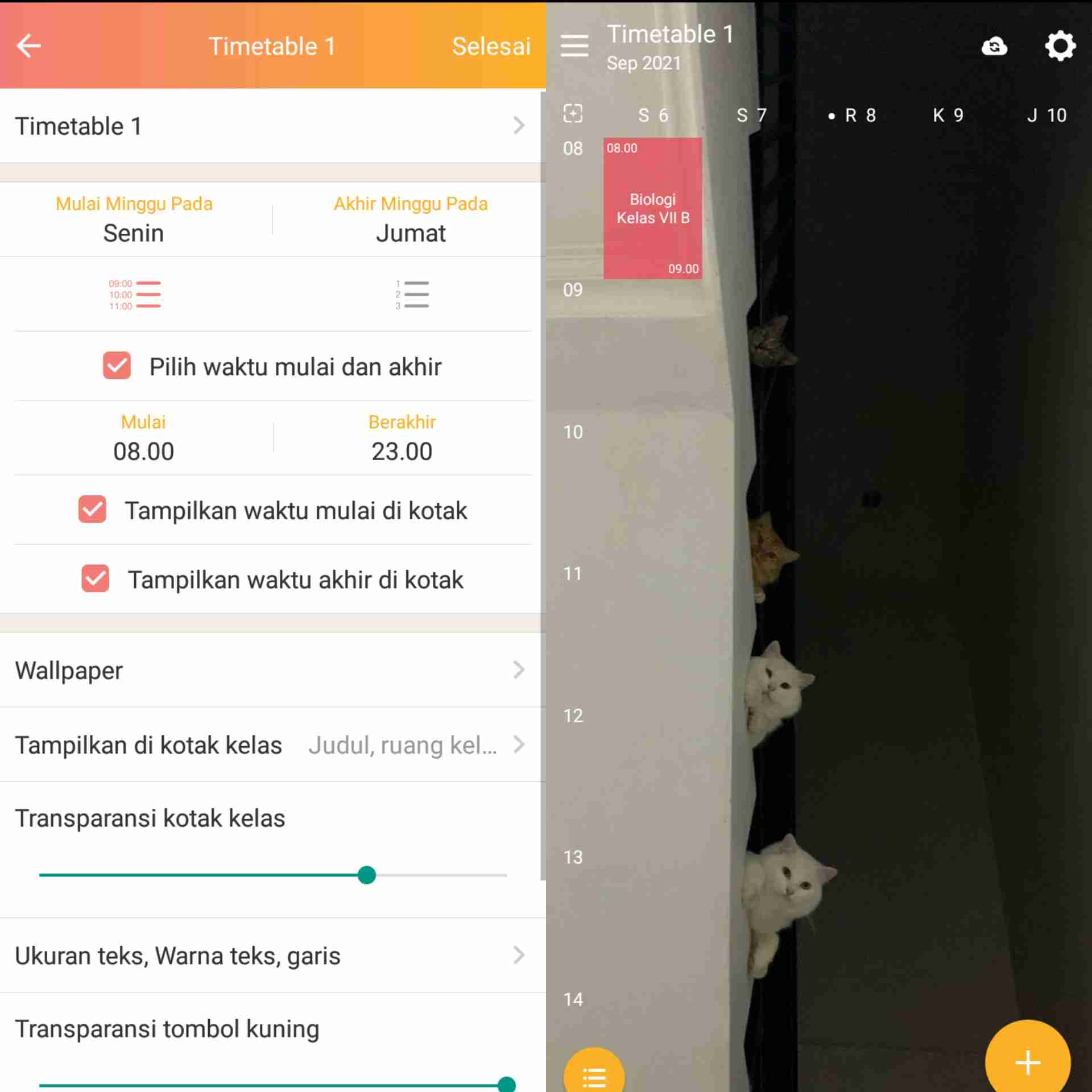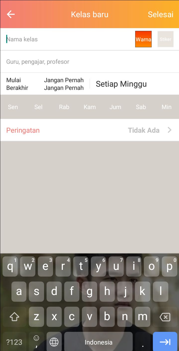 5. Setelah merubah background kamu dapat mulai membuat jadwalmu dengan mengklik menu lingkaran tambah disebelah kanan bawah. Kamu dapat mengatur nama kelas, hari mata pelajaran tersebut, guru yang mengajar, warna kotak jadwal, mata pelajaran dan pengingat waktu.