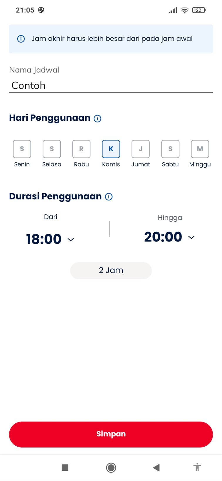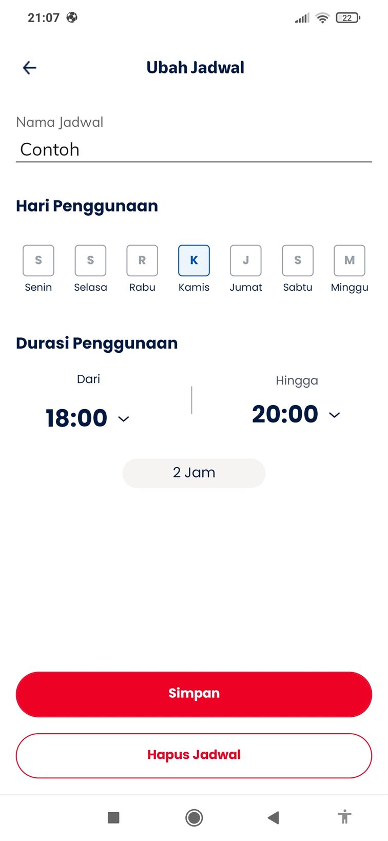 6. Setelah itu atur waktu penggunaan yang ada. Kamu bisa mengaturnya bebas untuk hari dan jam kapanpun. Semisal di sini mimin ingin mengatur waktu penggunaan WiFi dari iPhone yang terbatas di hari Kamis, dari jam 6 sore sampai dengan 8 malam, alias hanya 2 jam saja. Jangan lupa untuk beri nama Jadwal yang ada.