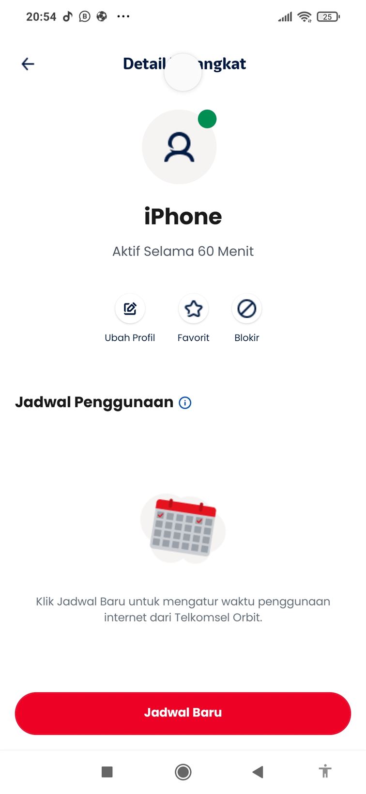 4. Detail terkait perangkat terhubung tersebut pun akan terbuka. Fokus saja pada tujuan utama kita yakni membuat jadwal penggunaan akses WiFi. Tekan segera tombol Jadwal Baru.
