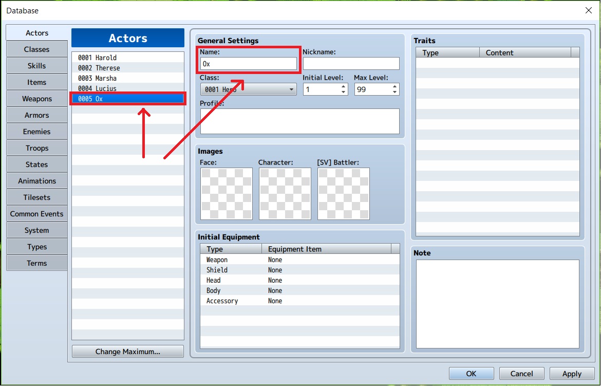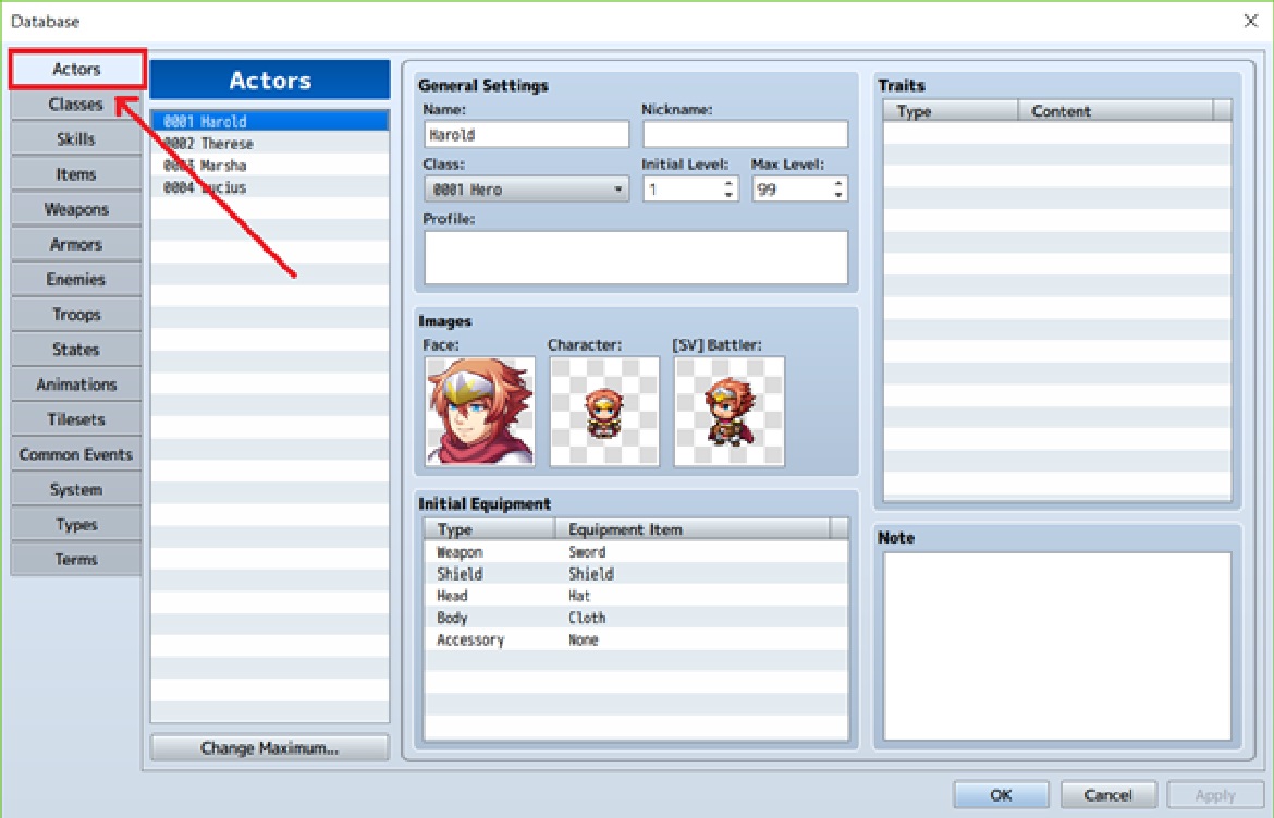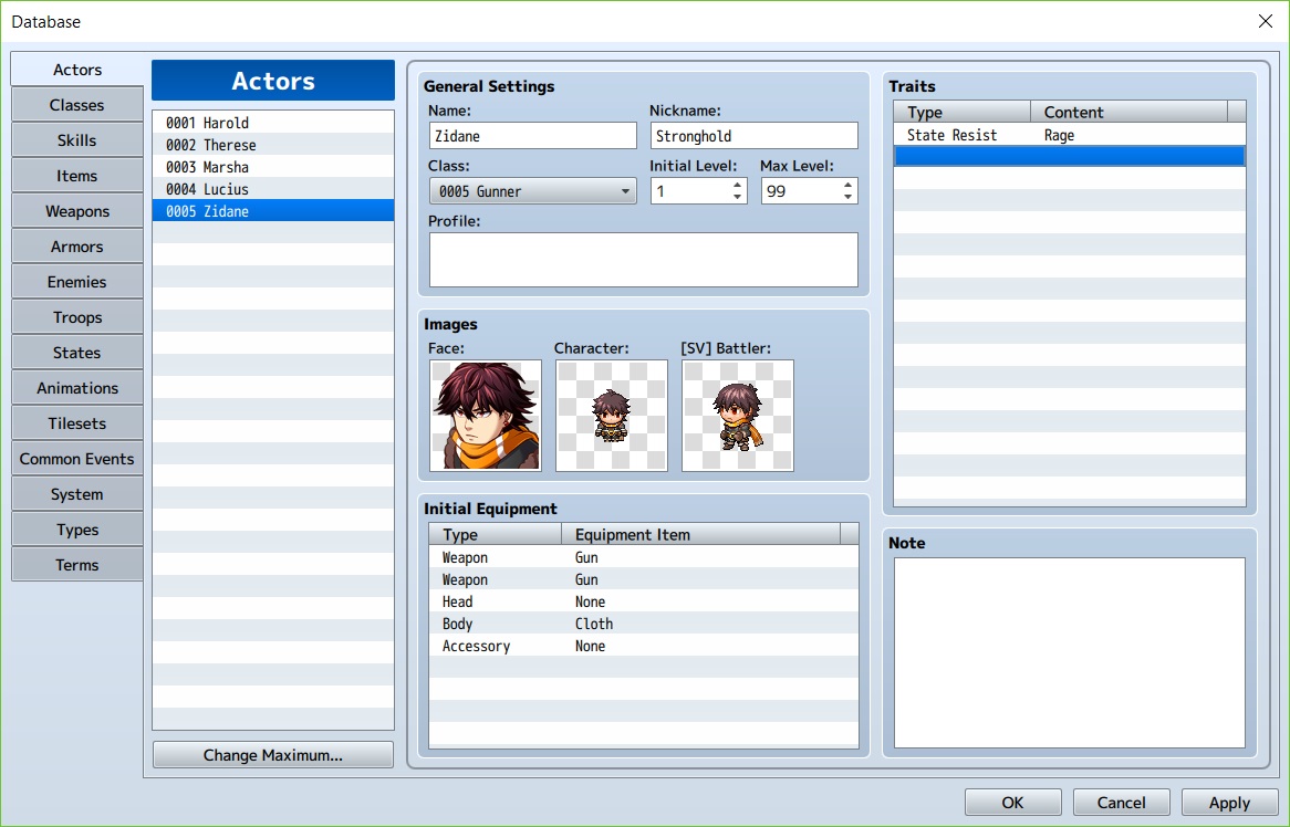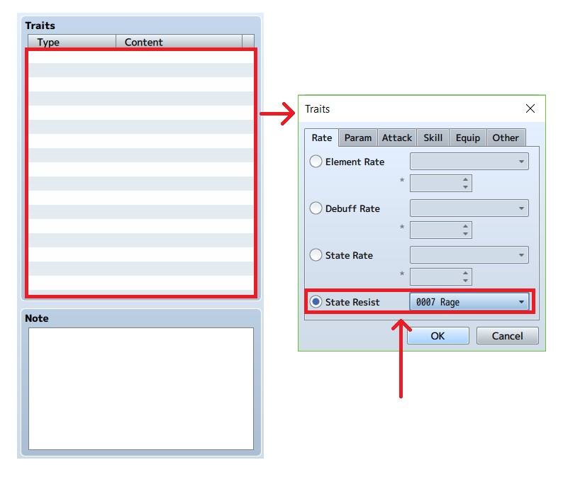 10. Jika kita geser ke sebelah kanan, kita akan mendapatkan menu “Traits”. Disini kita bisa mengatur apa-apa saja yang dimiliki karakter kita. . Mulai dari hitrate, Evasionrate, apa yang dapat digunakan, dll. Namun di bagian ini traitsnya berfokus pada karakternya saja. Kita tambahkan trait baru dengan cara double klik pada baris lalu pilih “state resist” lalu pilih “Rage”.
