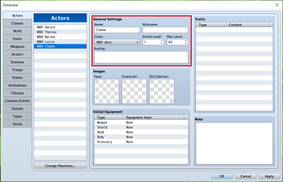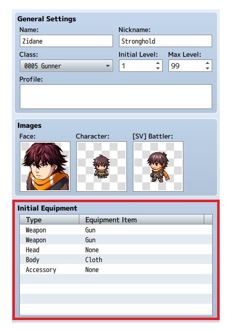 8. Di bawahnya terdapat menu “images” Disini kita bisa mengatur gambar apa saja yang bisa digunakan dan akan ditampilkan mana saat apapun. “Face” akan menggunakan gambar yang kita pilih untuk status screen, Character akan menggunakan gambar yang kita pilih untuk animasi berjalan, sedangkan [SV] Battler akan menggunakan gambar sebagai animasi saat bertarung. Cara memasukkannya mudah, cukup kita double click pada kotak, lalu pilih gambar yang sesuai dengan keinginan.