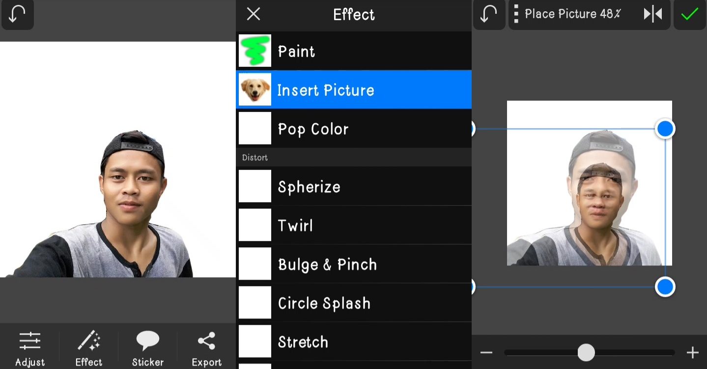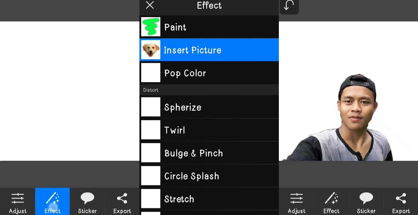 2. Lalu ketuk menu Effect dan Insert Picture. Cari gambar yang akan kamu edit menjadi karikatur.