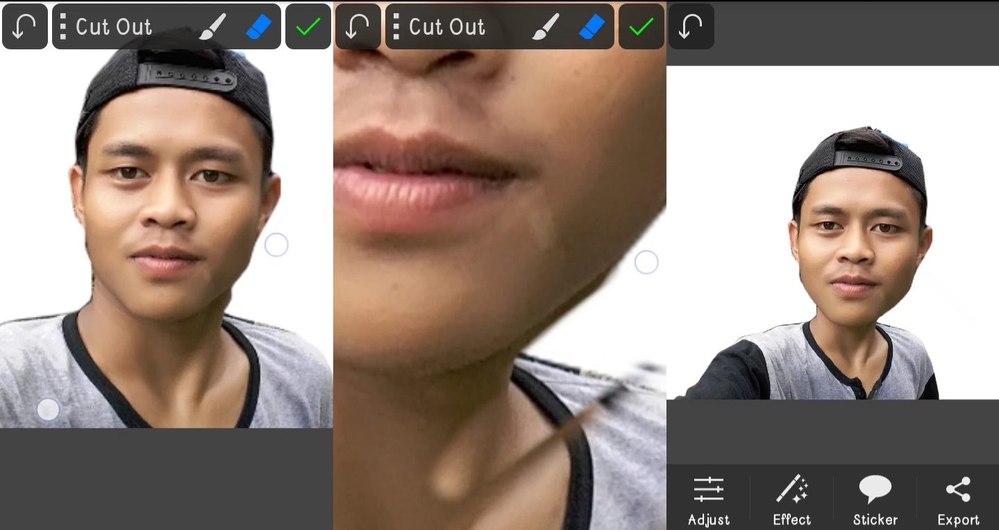 4. Lalu ke tahap proses insert ke dua. Kamu bisa mengetukan dua jari layar untuk memperbesar. Lalu gunakan erase tool untuk menghapus sebagian foto sisipan yang tidak di butuhkan.