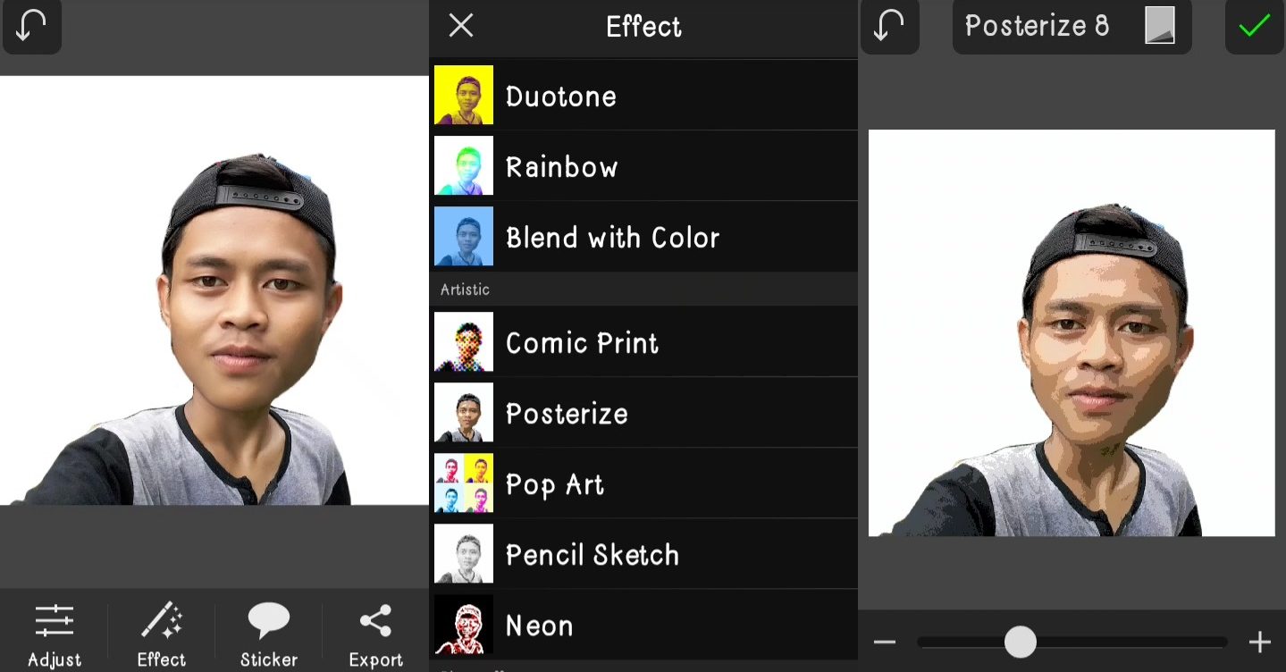 5. Untuk menambah efek, kamu bisa pergi ke menu effect, lalu cari efek yang kamu butuhkan. Dalam tutorial ini saya menggunakan efek Posterize.
