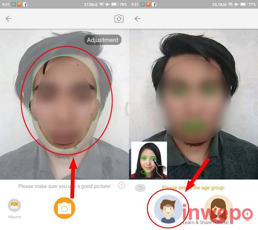 3. Sesuaikan wajah pada garis pola wajah berwarna hijau yang sudah di sediakan, jika sudah tap ikon kamera kemudian pilih gender atau jenis kelamin kamu.