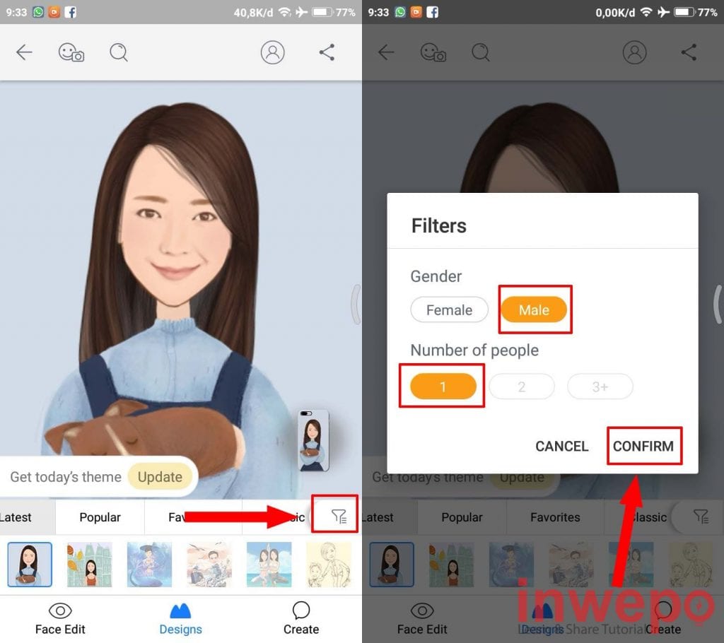 5. Tap ikon filter untuk memfilter template karikatur yang sesuai dengan gender atau jenis kelamin kamu.
