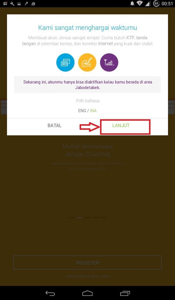 pendaftaran telah selesai dilakukan, akan tetapi akun jenius kita belum aktif. untuk mengaktifkannya, ada tulisan aktifkan kartu disebelah atas di aplikasi jenius klik tulisan tersebut, kemudian kita akan dibawa ke aplikasi map dari pihak JENIUS untuk mengetahui keberadaan kita dan tidak sampai 15 menit pihak JENIUS akan mendatangi kita untuk mengaktifkan akun JENIUS kita dan juga mengantarkan ATM JENIUS kita, pihak JENIUS akan meminta KTP asli kita dan juga tanda tangan untuk di foto dengan handphone dari pihak JENIUS. Untuk mengaktifkannya kita bisa lakukan pada jam 09.00 – 16.00 pada hari senin – sabtu, tergantung kita kapan kita berada dirumah.