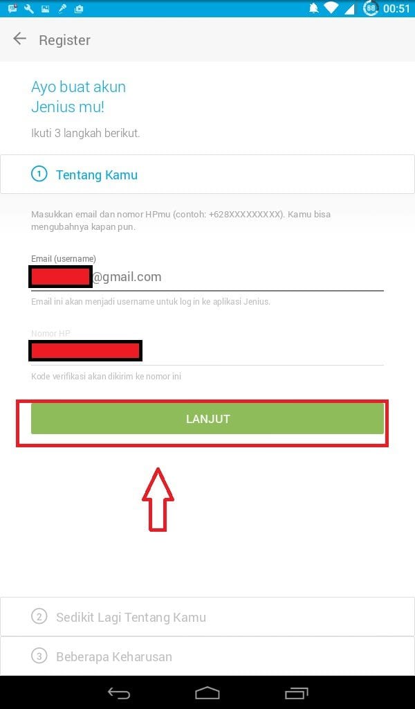 Isi data-data yang diperlukan dengan benar, seperti alamat email aktif dan juga nomor handphone, jika dirasa sudah benar klik lanjut.