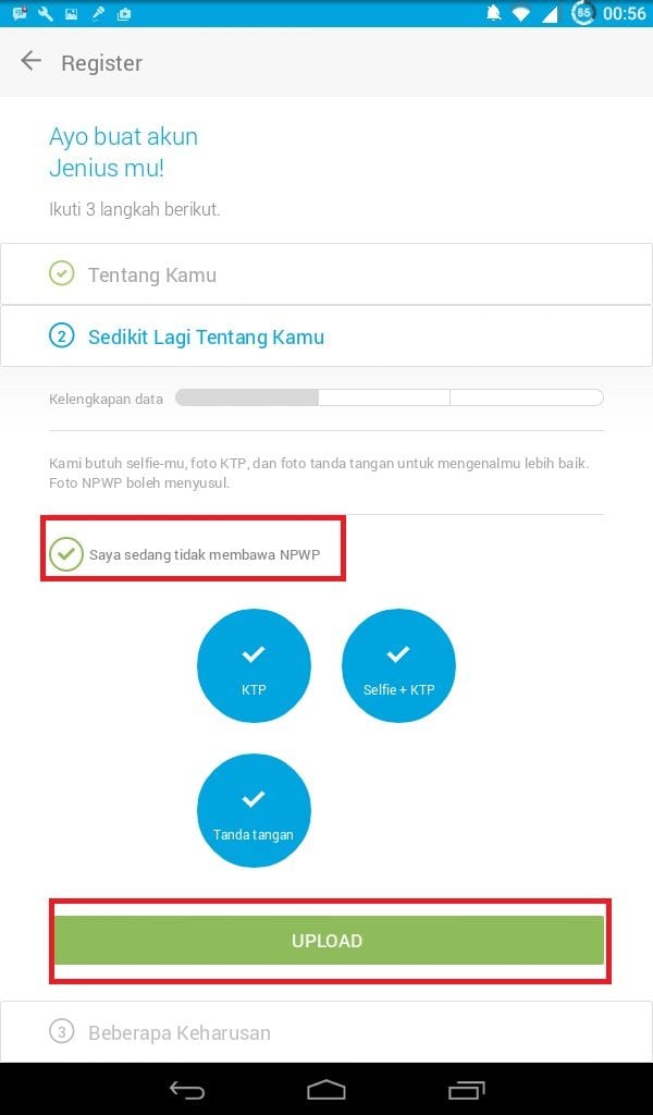 Foto pada KTP, selfie dengan memegang KTP, tanda tangan yang telah dibuat di kertas, dan NPWP bagi yang belum mempunyai NPWP centang bagian atas yang bertuliskan “saya sedang tidak membawa NPWP”, setelah semuanya selesai klik upload.