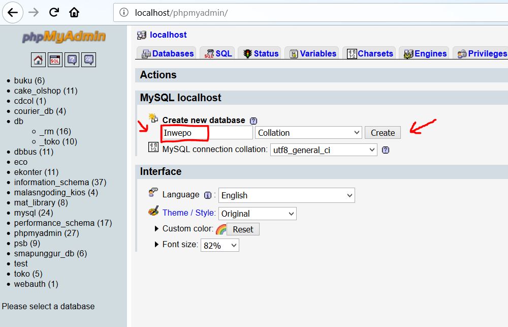 3. Langkah berikutnya anda buat nama databasenya, bebas dengan selera anda masing-masing. Yang perlu kamu ingat, nama database harus di ingat baik besar kecil hurufnya, karena ini untuk menghubungkan ke bahasa pemrograman php, jika salah maka akan terjadi error. Setelah selesai menamai database, pilih create.