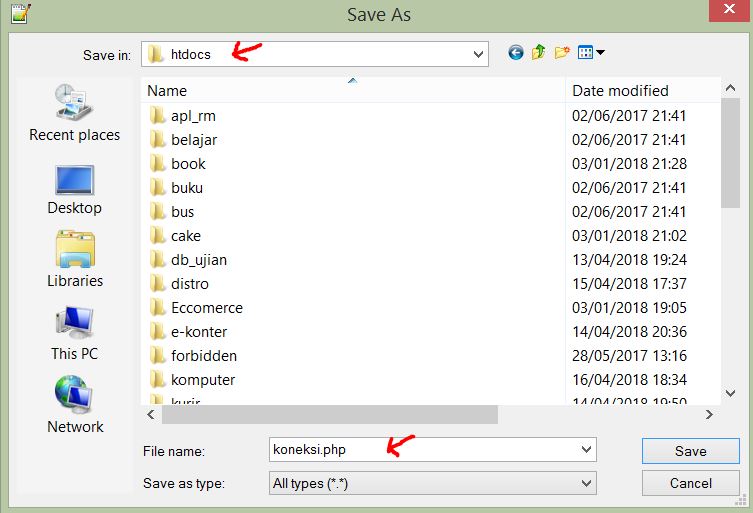 6. Kemudian anda simpan file tersebut di folder xampp/htdocs, dengan koneksi.php, kemudian save.