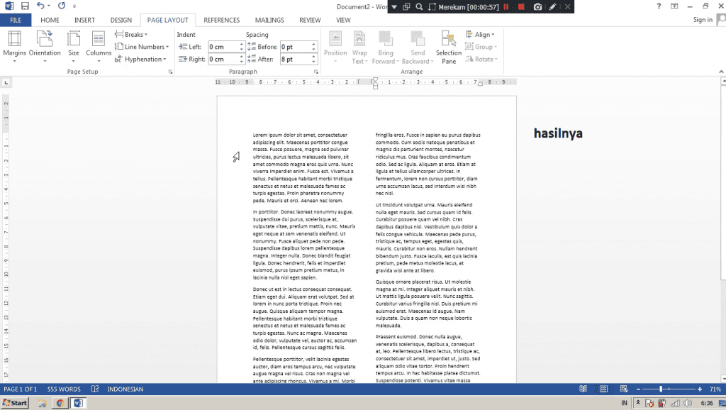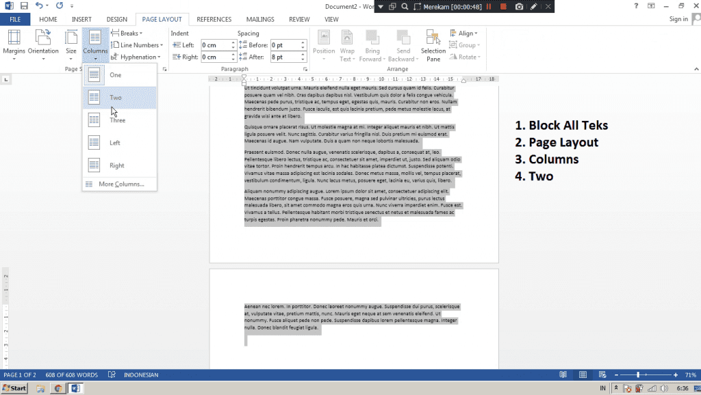 4. Lalu klik pada tab Page Layout – Column dan pilih Two.