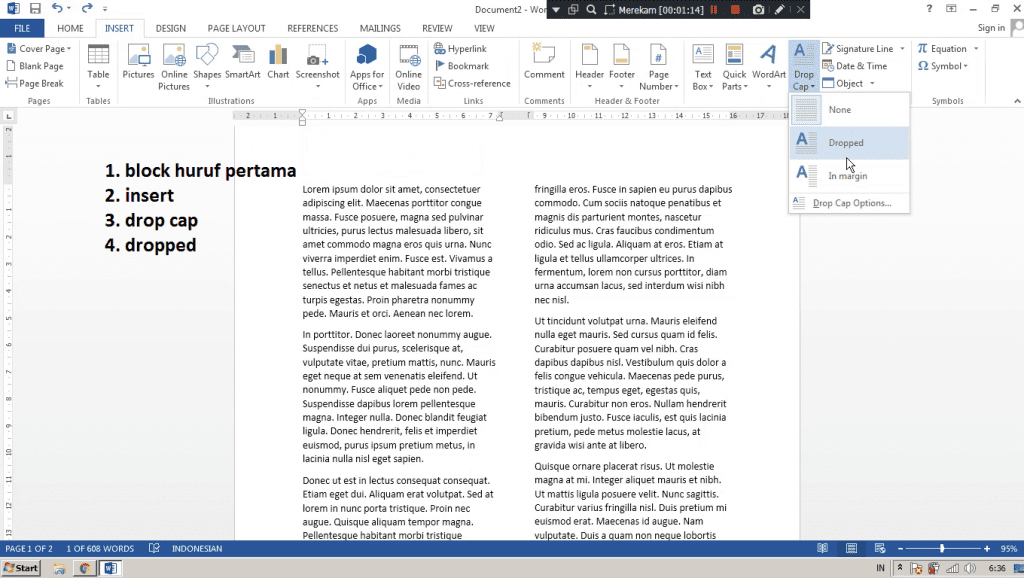 6. Lalu kamu blok huruf pertama pada dokumen kamu, dan klik tab Insert – drop cap – dropped.