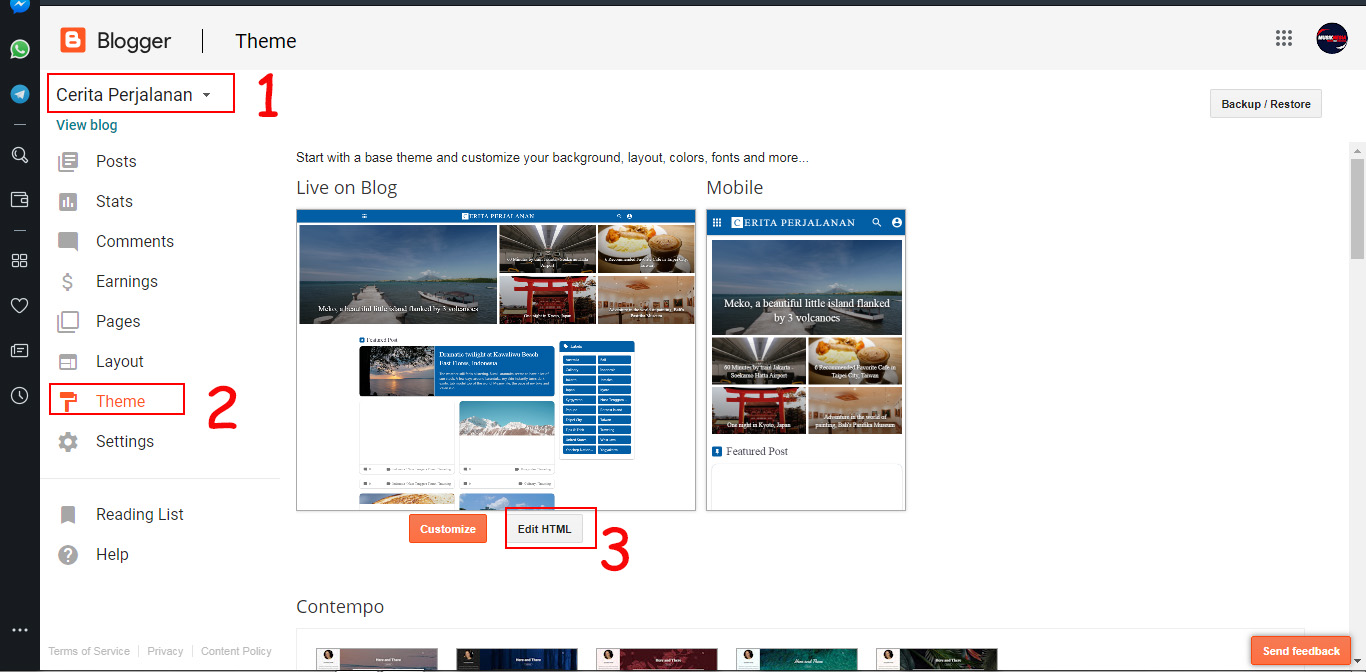 1. Log in ke akun Blogger – Tema – Edit HTML.
