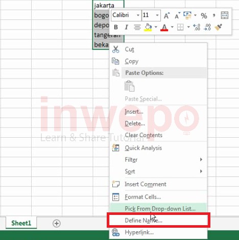 1. Buat daftar untuk menjadi isi dari dropdown yang akan kamu buat – lalu kamu block semua cells tersebut dan klik kanan – Define Name.