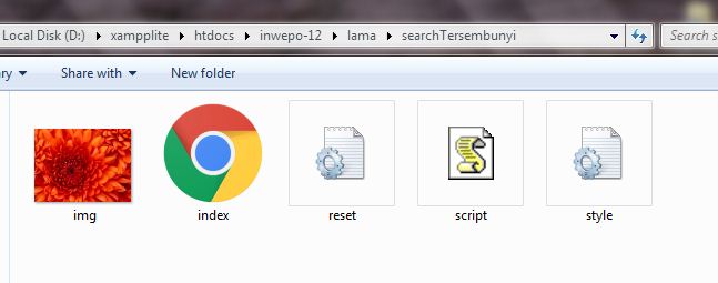 Simpan kode HTLM5 di atas di folder xampplite – htdocs – buat folder baru dengan nama SecretSearching – simpan kode di atas dengan nama index.html.