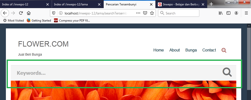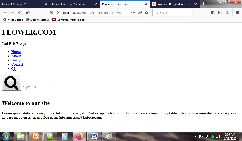 <!DOCTYPE html> <html lang="en"> <head> <meta charset="UTF-8"> <title>Pencarian Tersembunyi</title> <link rel="stylesheet" href="style.css"> <link rel="stylesheet" type="text/css" media="all" href="http://netdna.bootstrapcdn.com/font-awesome/4.0.3/css/font-awesome.css"> <script type="text/javascript" src="http://ajax.googleapis.com/ajax/libs/jquery/1.11.0/jquery.min.js"></script> <script src="script.js"></script> </head> <body> <div class="container"> <header> <div class="logo"> <h1>FLOWER.COM</h1> <p>Jual Beli Bunga</p> </div> <div class="top-menu"> <ul> <li><a href="#">Home</a></li> <li><a href="#">About</a></li> <li><a href="#">Bunga</a></li> <li><a href="#">Contact</a></li> <li><a href="#" id="searchtoggl"><i class="fa fa-search fa-lg"></i></a></li> </ul> </div> </header> <div id="searchbar" class="clearfix"> <form id="searchform" method="get" action="searchpage.php"> <button type="submit" id="searchsubmit" class="fa fa-search fa-4x"></button> <input type="search" name="s" id="s" placeholder="Keywords..." autocomplete="off"> </form> </div> <section class="banner"> <br> </section> <div class="content"> <h2>Welcome to our site</h2> <p>Lorem ipsum dolor sit amet, consectetur adipisicing elit. Aut excepturi blanditiis ducimus veniam fugiat voluptatibus alias, consectetur debitis consequatur ab vero atque error, ex ut culpa quam laborum enim? Laboriosam.</p> </div> </div> </body> </html>