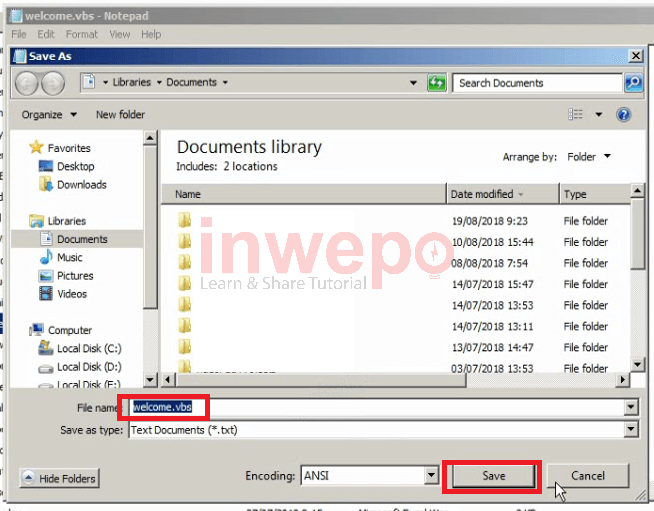 4. Lalu kamu klik pada tab menu File – save as, dan kamu beri nama welcome.vbs, lalu klik save.