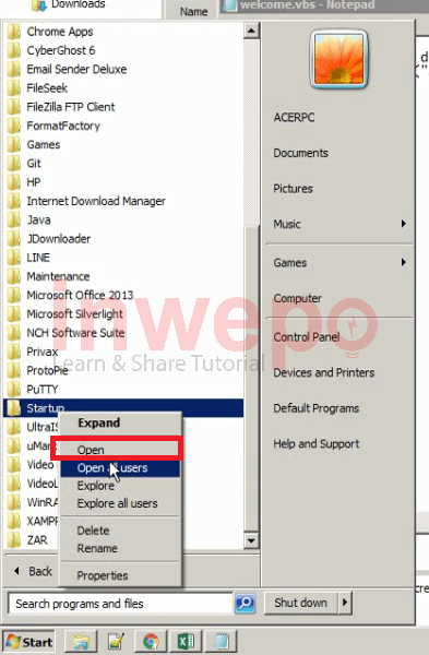 5. Jika sudah kamu simpan, kamu klik start menu dan cari folder startup dan kamu klik kanan – open.