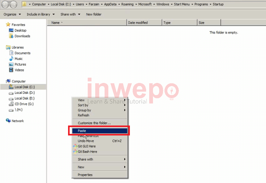 6. Lalu kamu copy file welcome.vbs yang tadi kamu simpan ke folder startup tersebut, klik Paste.