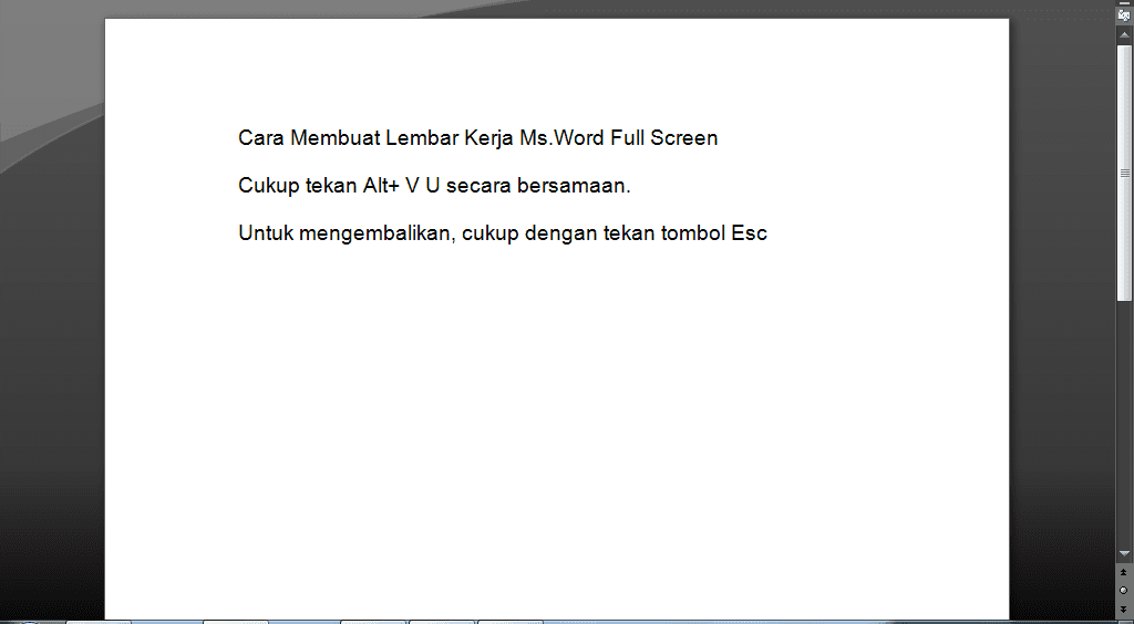 4. Untuk mengembalikan tampilan dokumen Ms.Word, cukup tekan tombol Esc dan tampilan dokumen kembali seperti semua. Selesai.