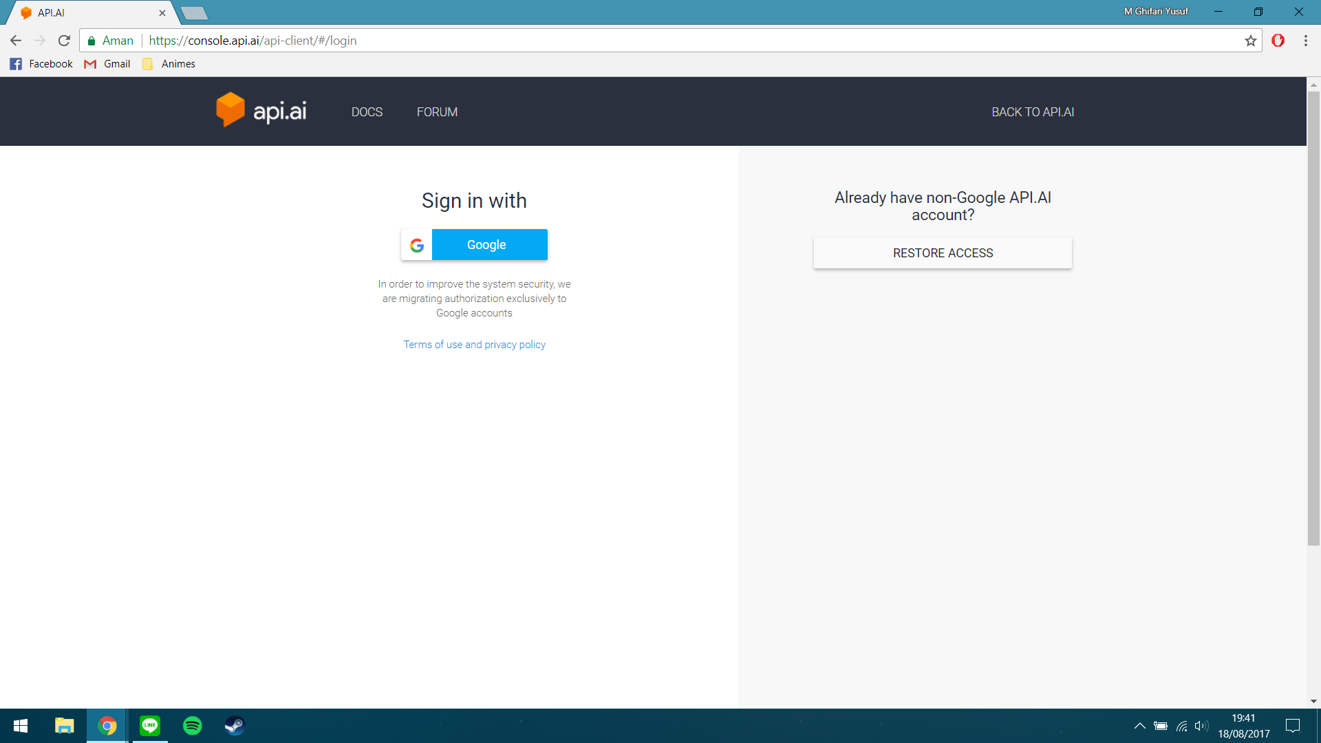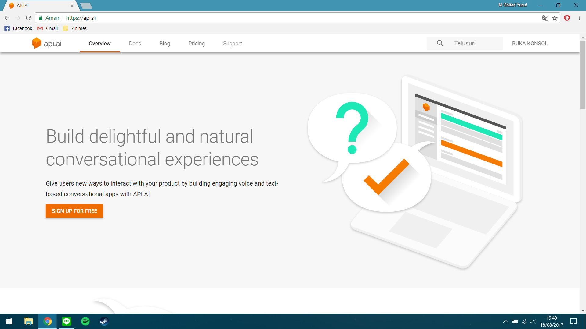 API.AI merupakan salah satu layanan bot yang dapat mempermudah kita membuat Chatbot, dengan menggunakan layanan dari API.AI kita dapat mudah membuat Chatbot yang sensitif layaknya manusia yang dapat membalas semua pertanyaan atau kata demi kata.