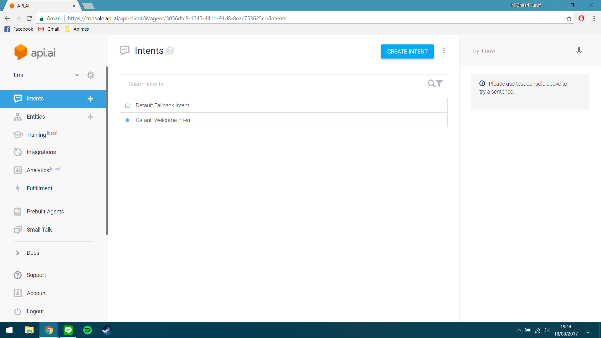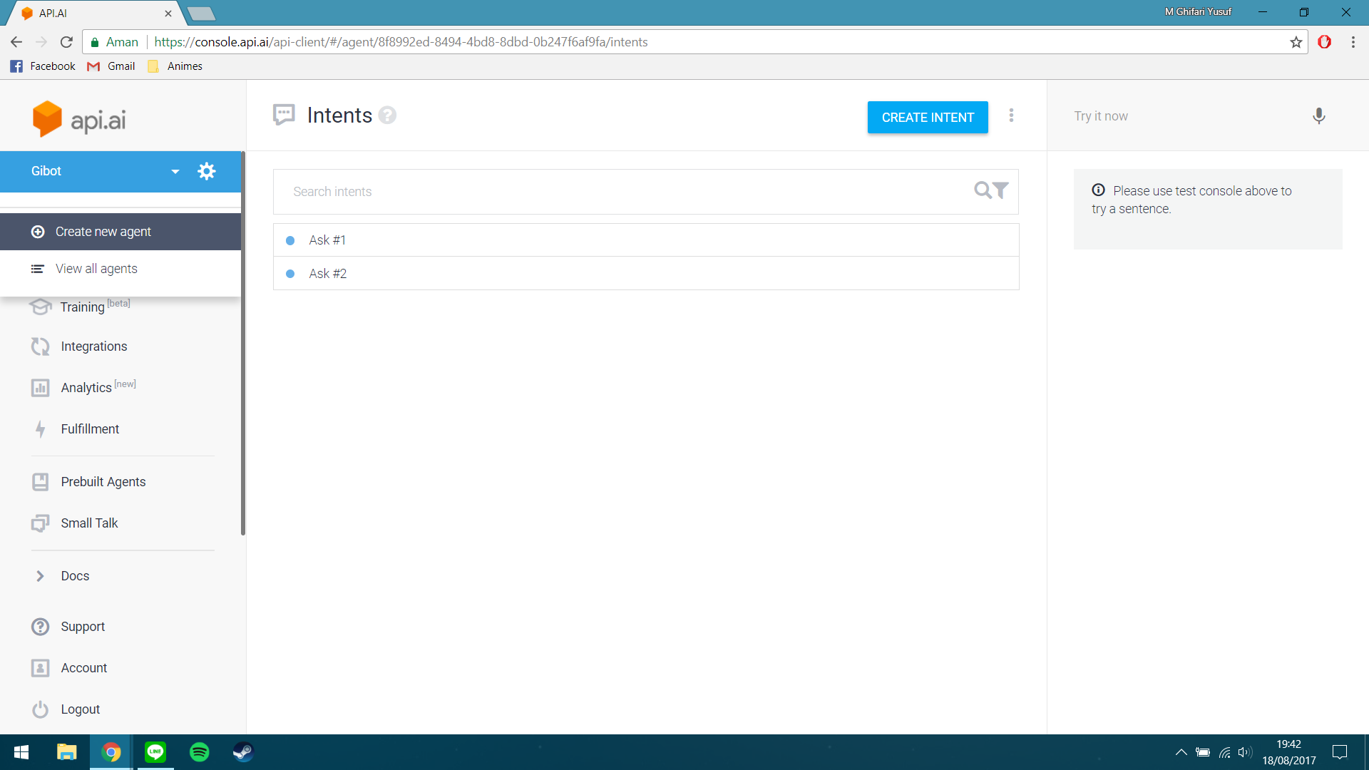 6. Ke halaman console API.AI, https://console.api.ai/api-client di sebelah kiri menu pilih Intents.Â