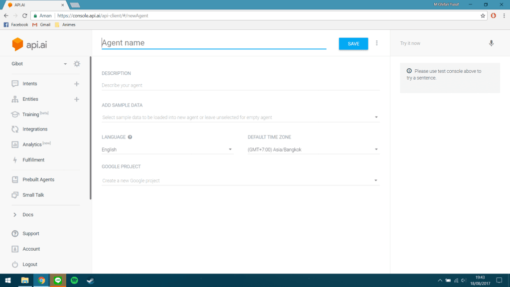 Isi Agent name dengan nama bot kamu, form yang lainya biarkan saja kosong atau tidak perlu di isi lalu pilih Save.