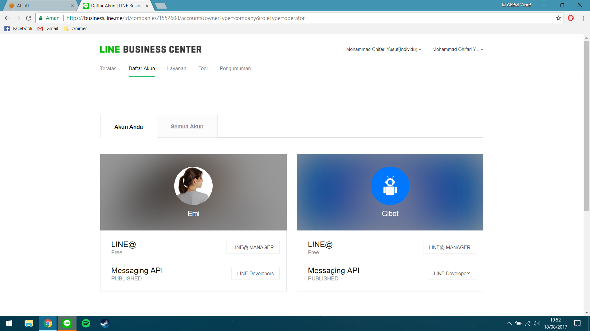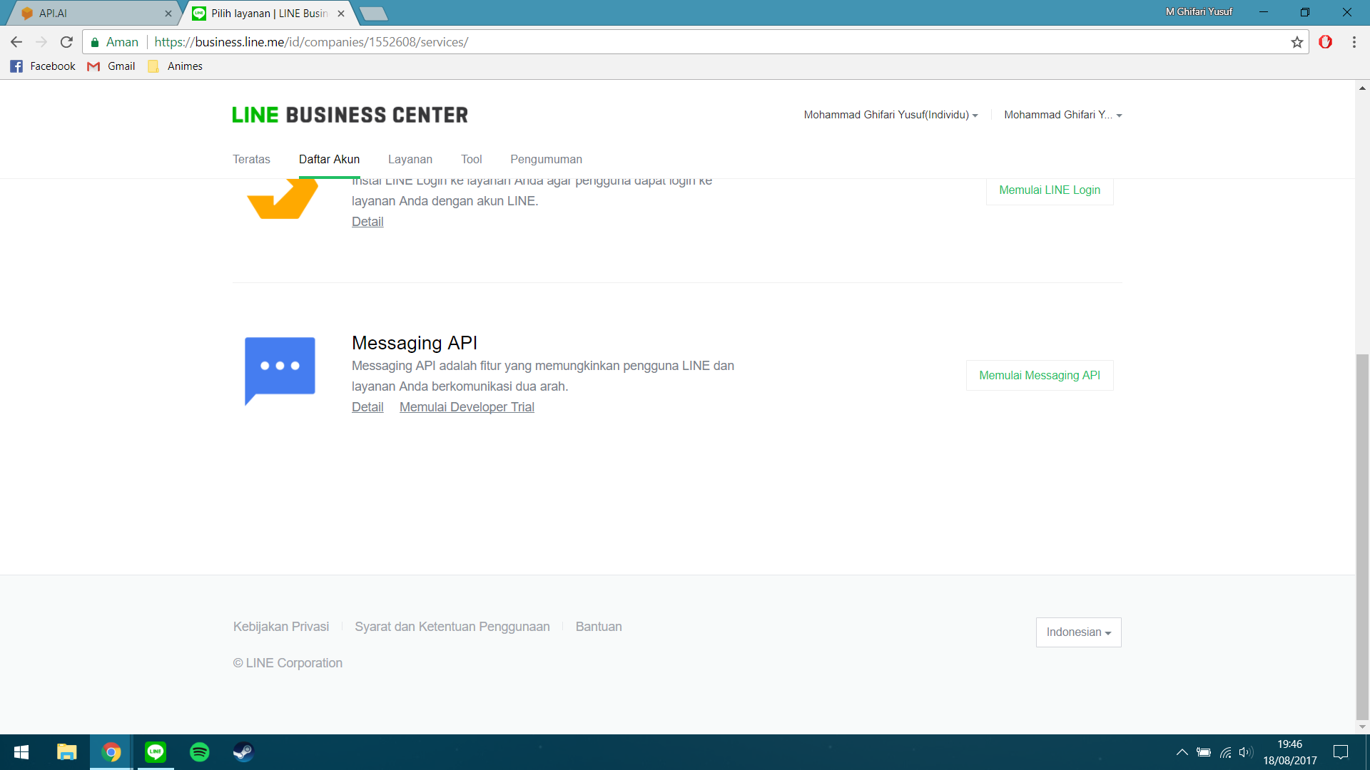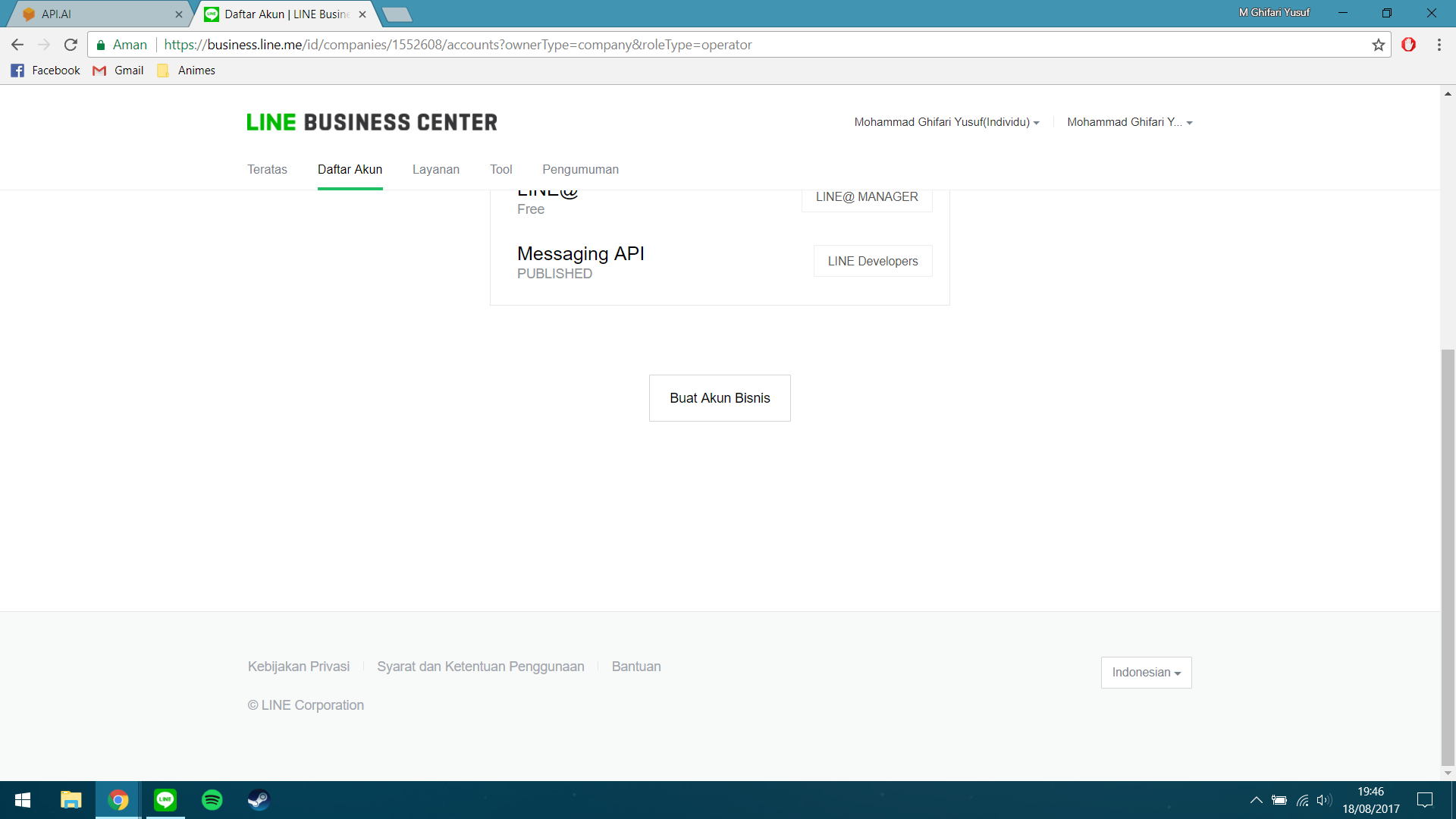 10. Kembali ke LINE Business Center, pilih Daftar Akun dan di halaman tersebut terdapat akun bot yang sudah kamu buat, lalu pada bagian Messaging API pilih LINE Developers.
