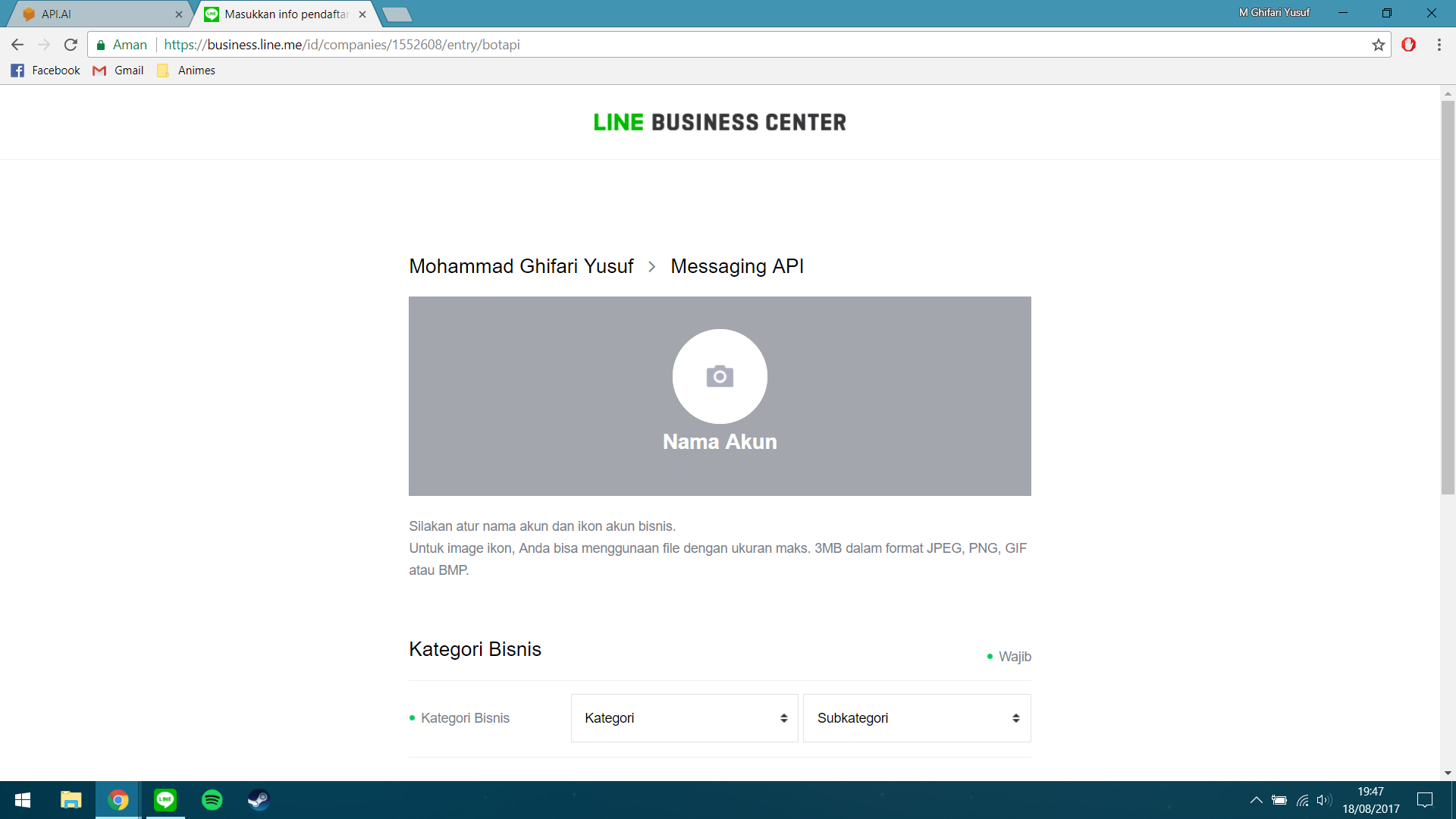 Dalam tutorial ini akan di bagi menjadi 2 tutorial, yang ke-1 membuat akun bot di LINE dan yang ke-2 mengkonfigurasikan akun bot LINE ke API.AI. Apabila kamu sudah memiliki akun bot silakan langsung mengikuti langkah yang ke-2, tetapi apabila kamu belum memiliki akun bot kamu harus mengikuti dari awal.