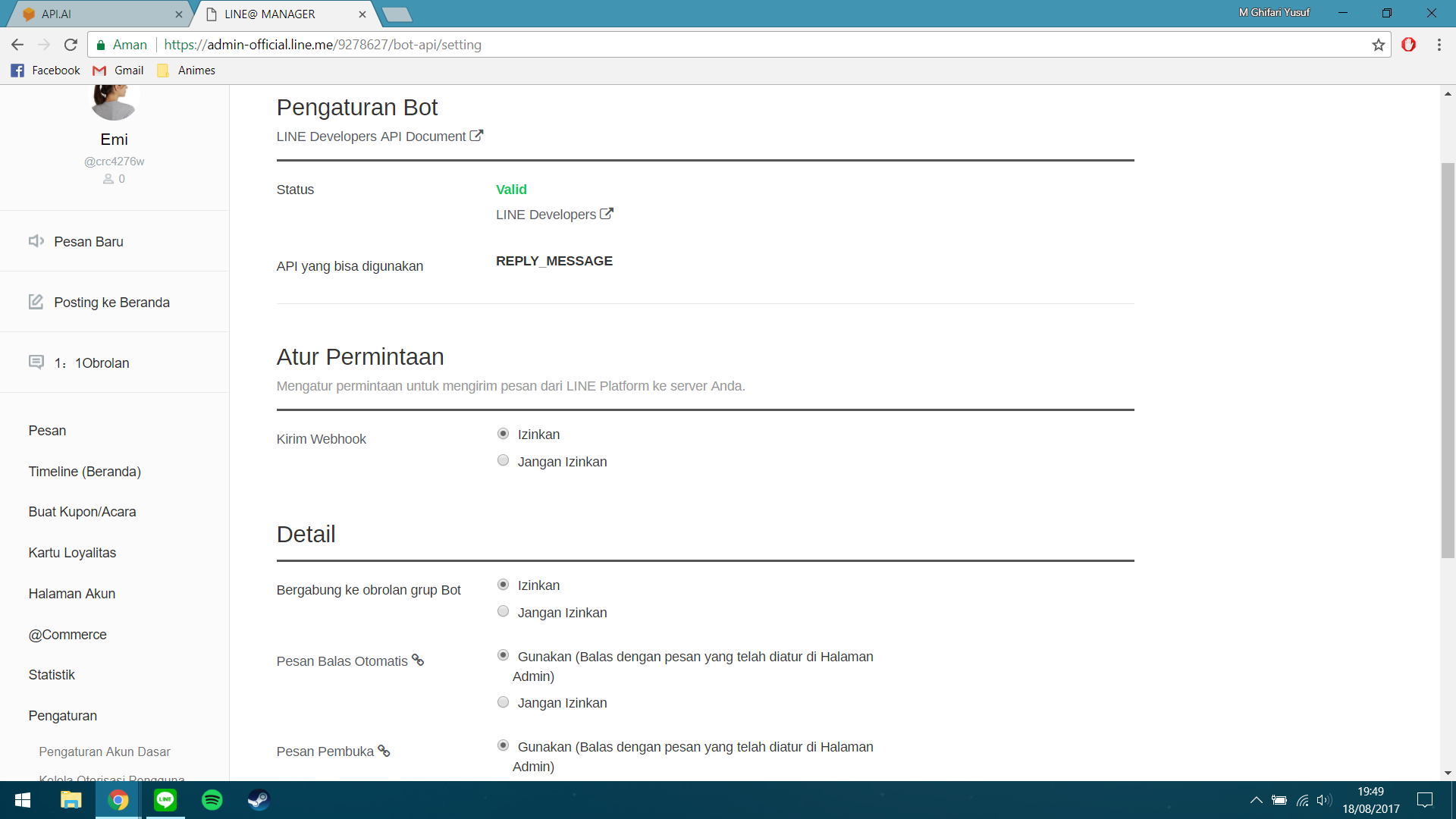 7. Pada halaman Pengaturan bot terlihat Status Tidak Valid, kamu klik tombol Gunakan API kemudian Konfirmasi dan Oke