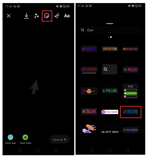 3. Sebelum memposting foto maupun video tersebut ke Story Instagram, tekan ikon Stiker pada menu atas Story Instagram. Scroll kebawah dan cari stiker yang bernama Link/ Tautan.