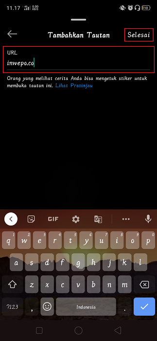 4. Kemudian, kamu akan diarahkan ke halaman Tambahkan Tautan. Ketikkan alamat situs yang ingin kamu share pada kolom URL yang sudah disediakan dan pilih tombol Selesai.