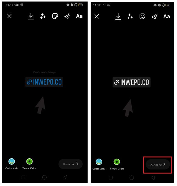 5. Atur posisi link di Story Instagram, kemudian pilih pada link untuk merubah tampilan color pada font link. Bila sudah, tekan tombol Kirim ke untuk men-share Story Instagram kamu.