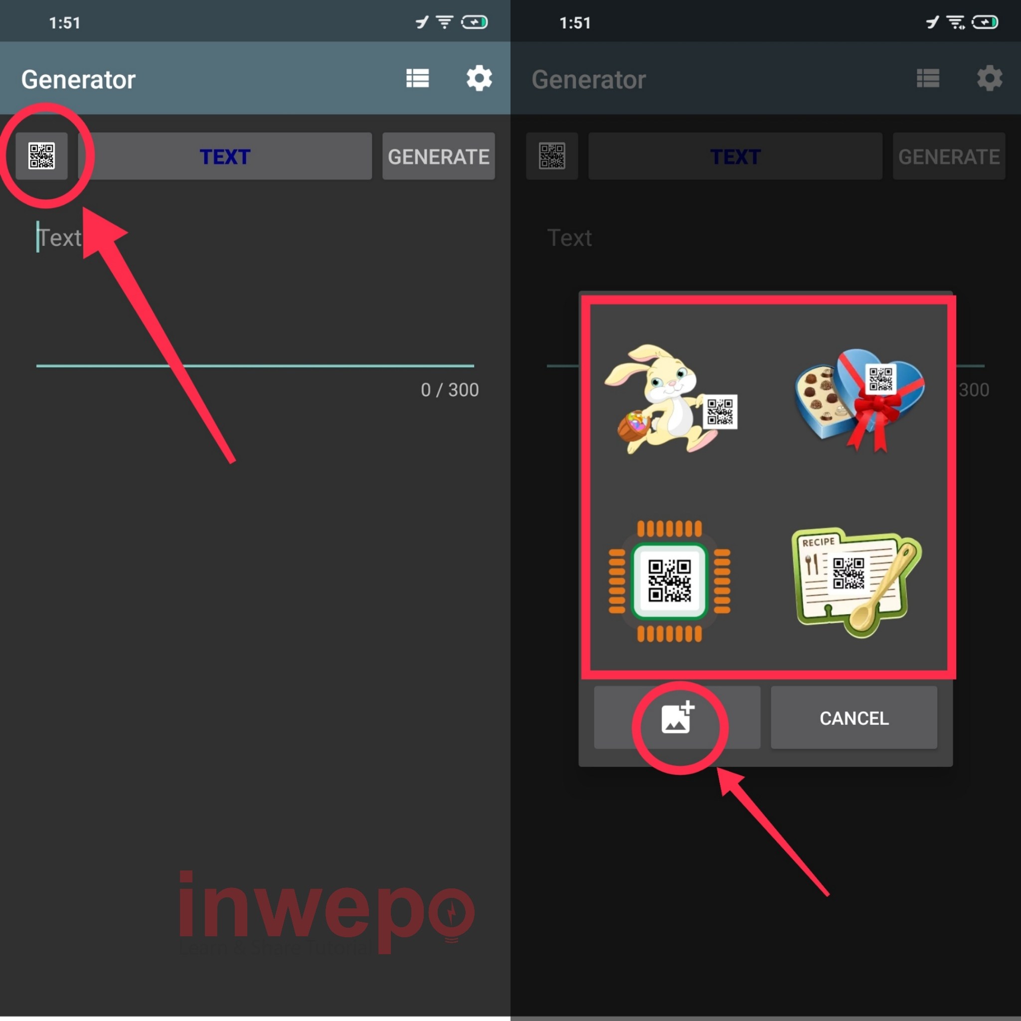 3. Langkah ketiga, buka aplikasi QR Barcode Generator pilih icon QR untuk memilih template gambar QR Code. Untuk menambahkan gambar milik mu sendiri tap icon picture plus.