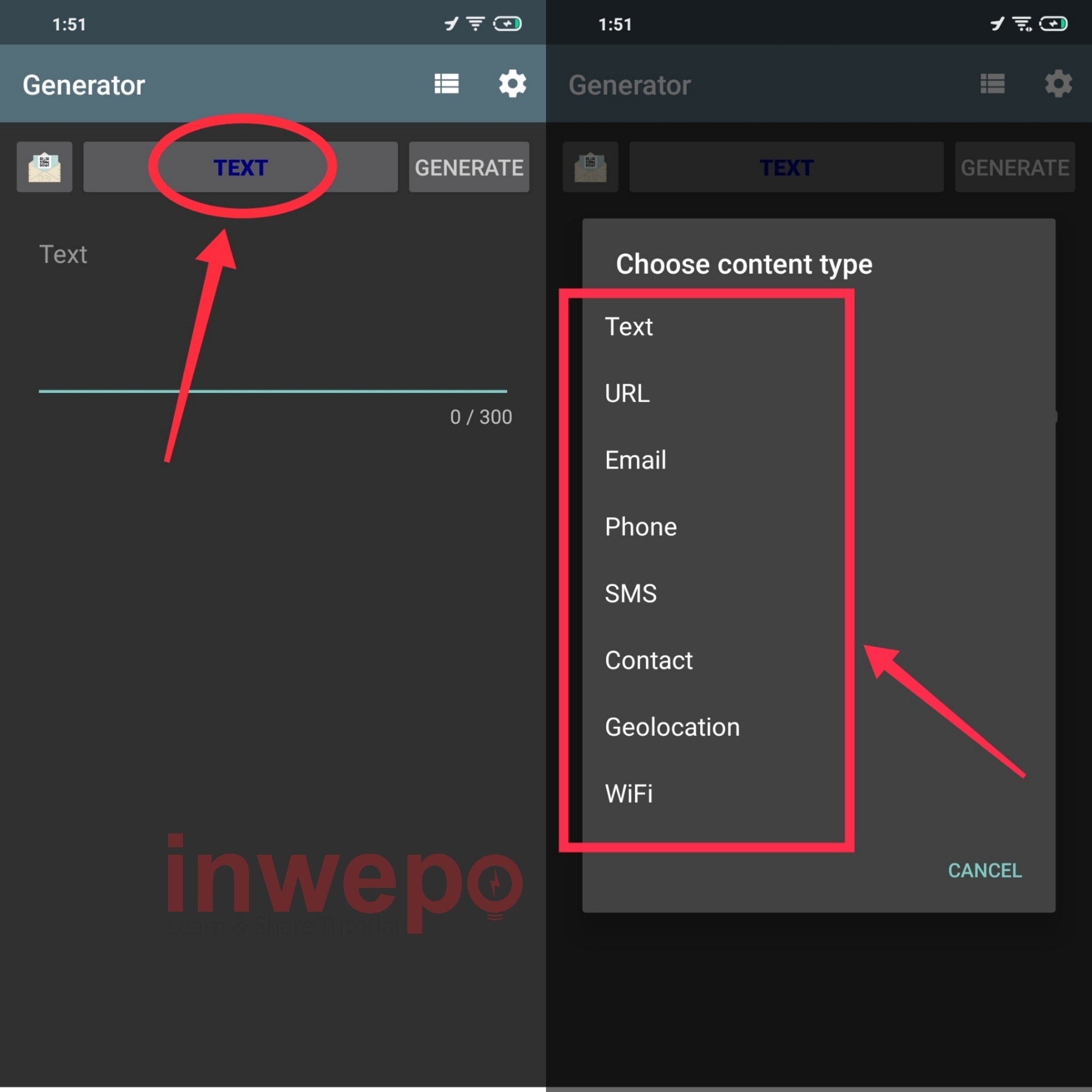 4. Langkah keempat, tap menu TEXT selanjutnya pilih tipe konten yang akan di gunakan. Disini saya memilih text.