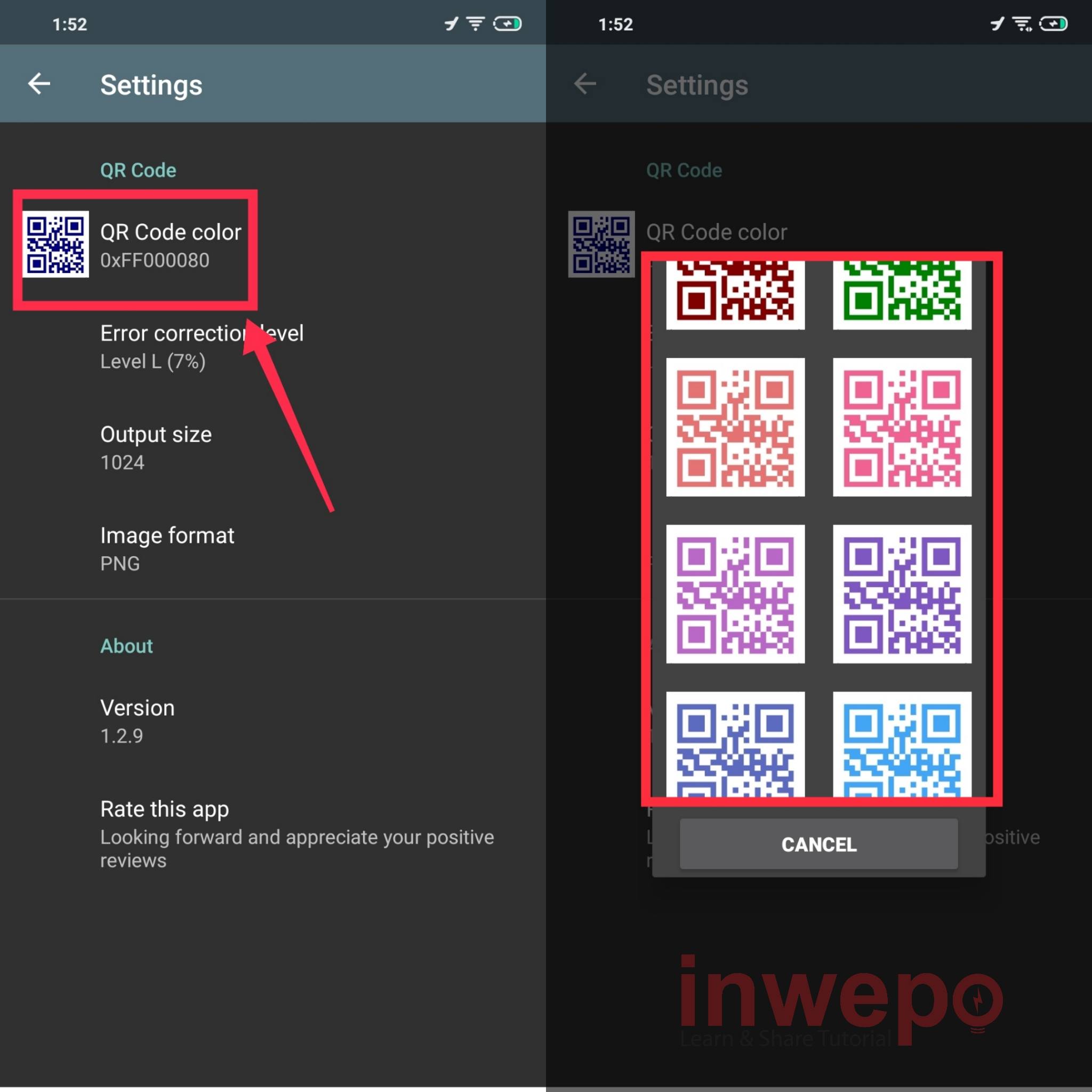 5. Langkah kelima, buka menu setting atau tap icon gear kemudian gunakan menu QR Code Color untuk mengubah warna QR.