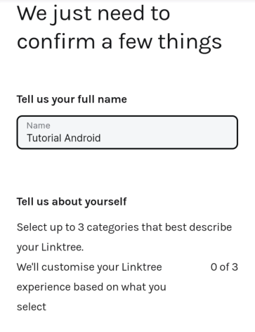 4. Pada halaman berikutnya, pilih tiga kategori yang menggambarkan akun Linktree kamu.