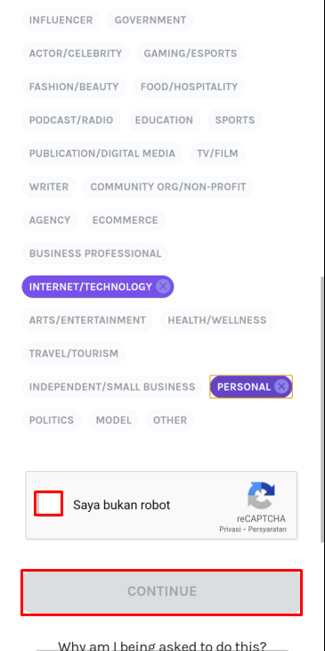 6. Kemudian centang Captcha dan klik Continue untuk melanjutkan proses pendaftaran akun.