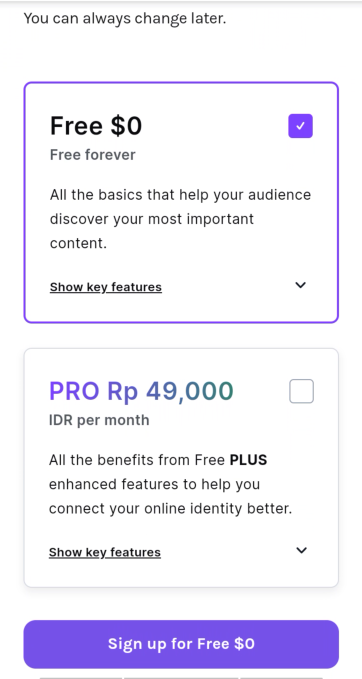 7. Pilih versi Linktree yang akan kamu gunakan. Pada tutorial ini kami akan memilih versi gratis, silahkan pilih Sign up for free.