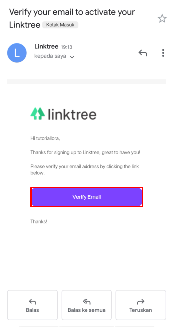 8. Selanjutnya, silahkan buka email yang kamu daftarkan dan cari pesan dari Linktree. Buka pesan tersebut, lalu Verify Email untuk memverifikasi akun Linktree kamu.
