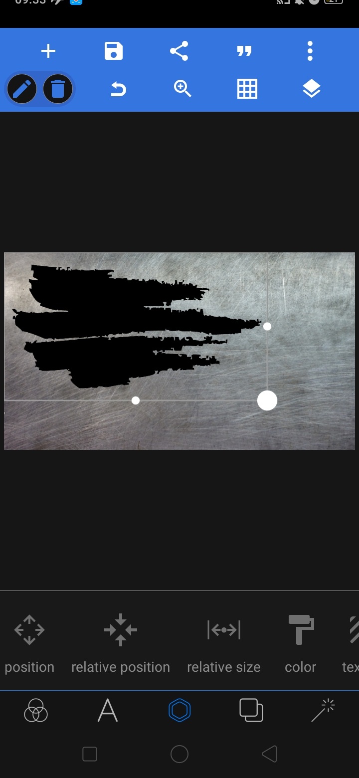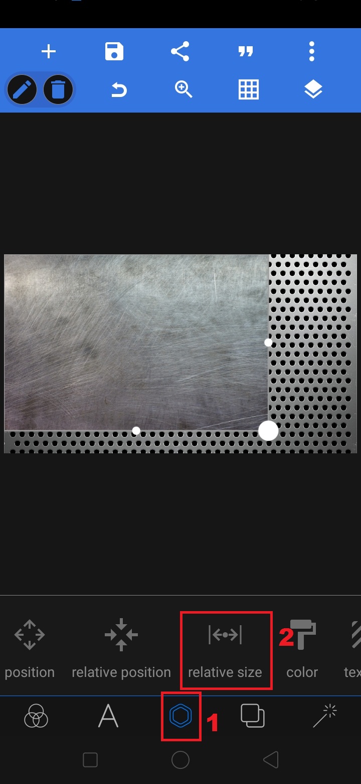 Untuk menyesuaikan ukuran gambar background dengan metal-background, klik ‘segi enam’ – pilih ‘relative size’.