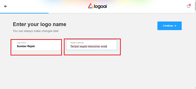 2. Masukkan nama merek dan slogan bisnis Anda di kotak teks yang tersedia di bagian atas halaman. Setelah itu klik “Continue”.